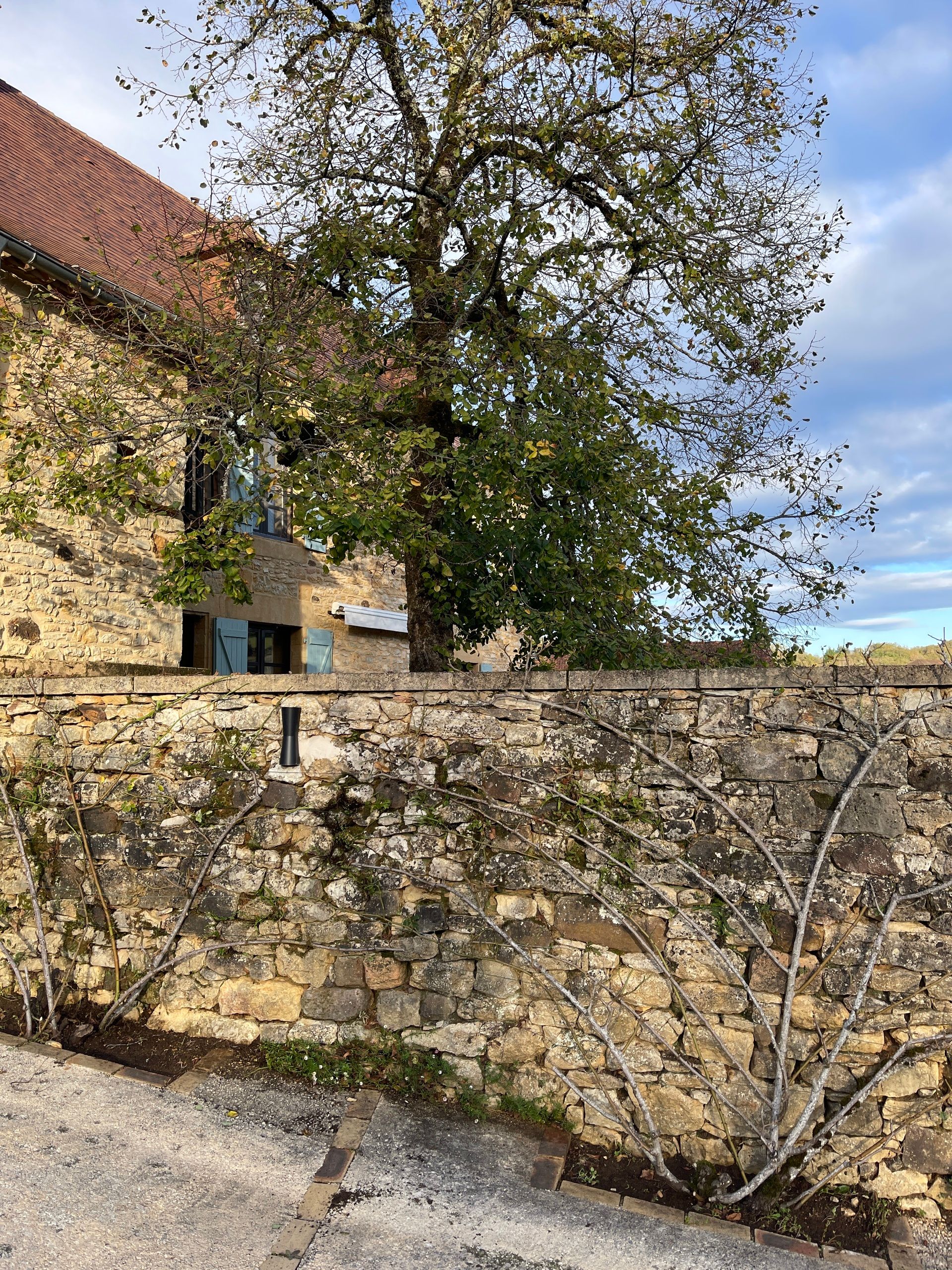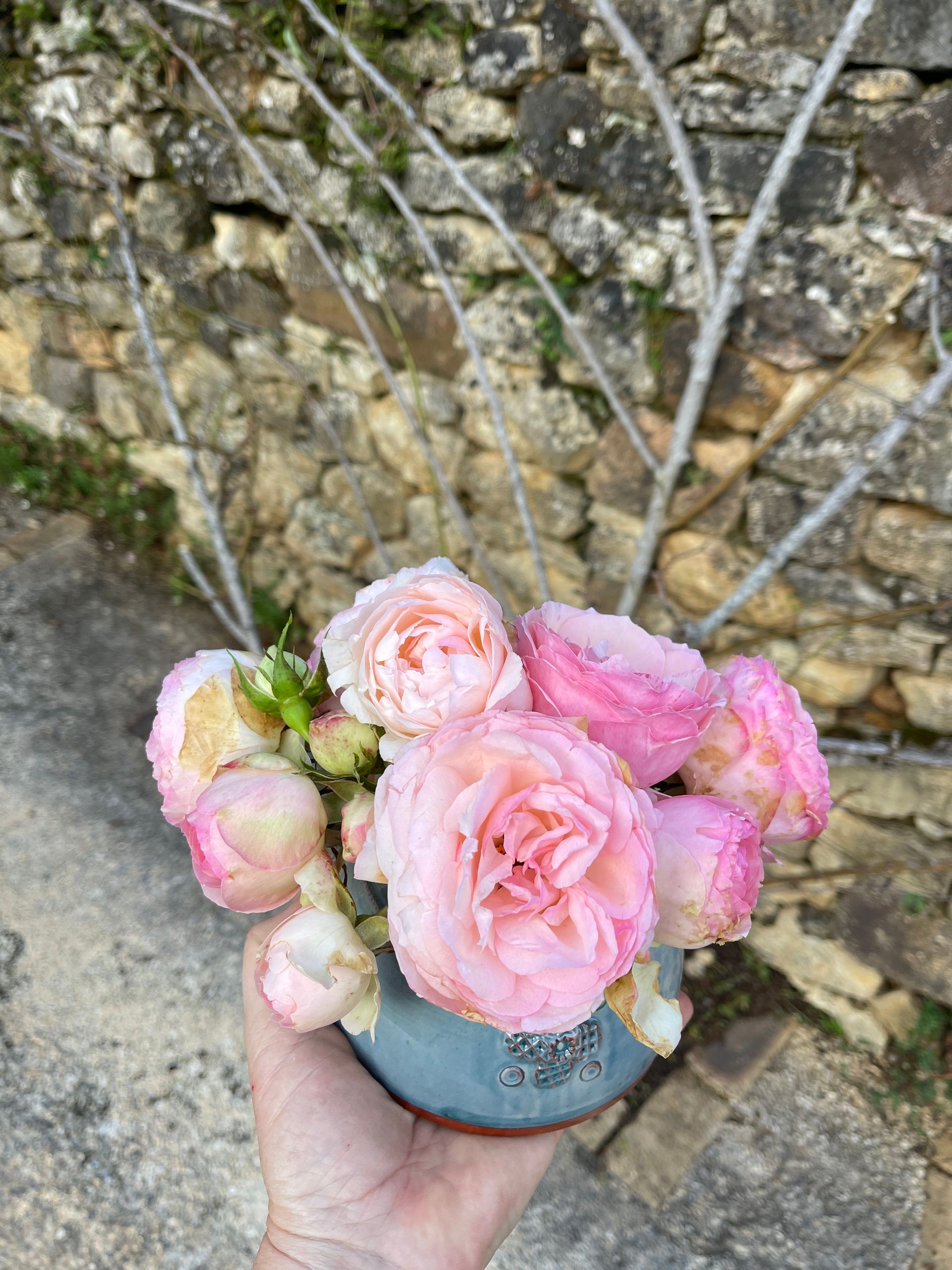 When I first set eyes on Les P, it was the roses at the gate that drew me in. These Pierre de Ronsard were planted by my predecessor, and my job is simply to keep them alive. Not being naturally green-fingered, I usually tackle the annual pruning with the help of a friend but this year I managed the fantail jigsaw toute seule : )Ā