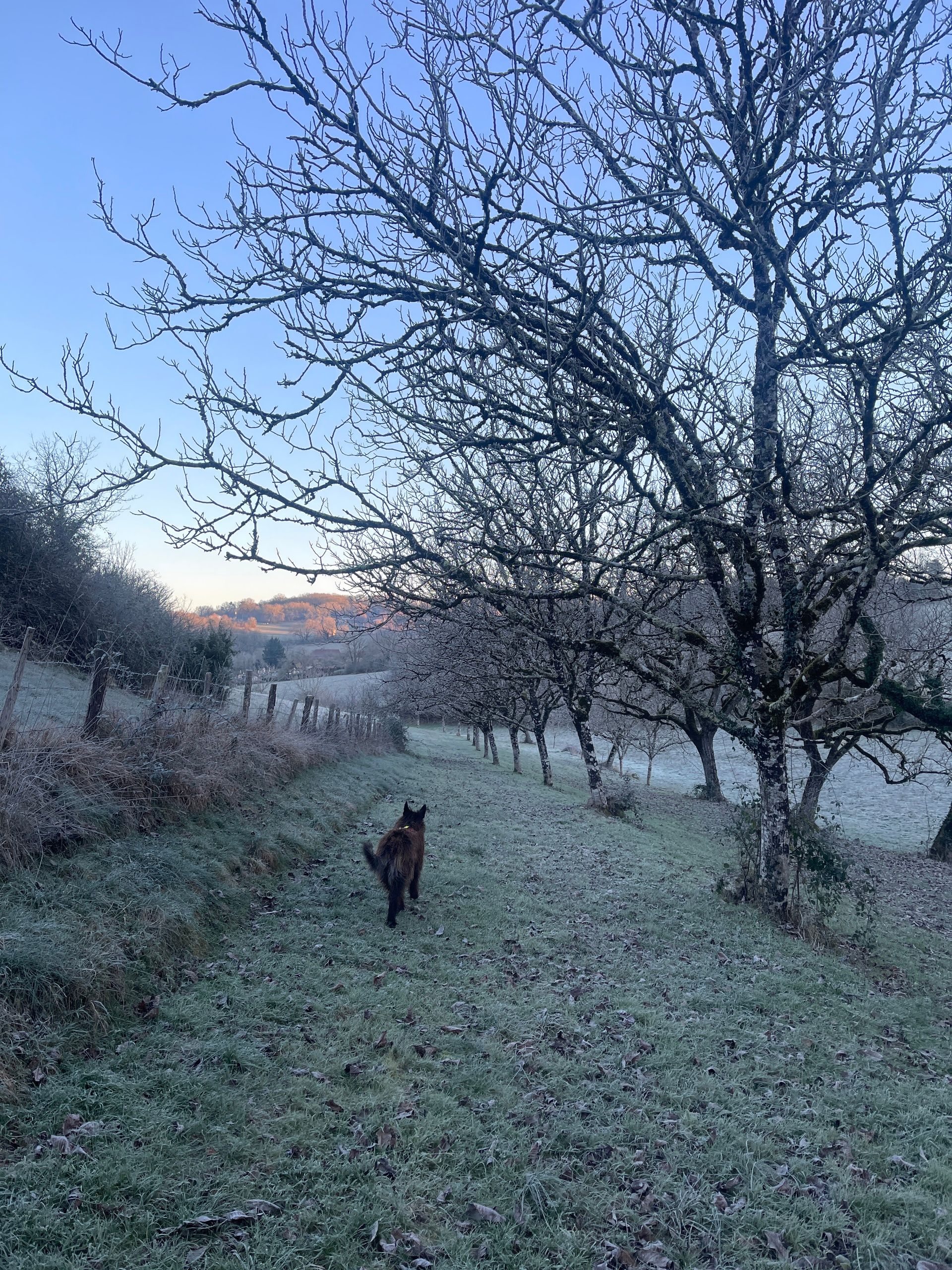 Back home, unlike northern Europe, we don’t have snow (though there’s the slight possibility tonight) but we do have exceptionally cold temperatures. A supply run to Salviac, home to the nearest supermarche, registered minus 12. Ykes!! If it were up to me, I’d remain cosily ensconced inside, however, Miss Romy loves, loves, loves the frost. So, I wrap up Michelin-style to accompany her on her excited frost-rolling, frost-zooming expeditions – and it definitely brings a smile to your (frozen) face!