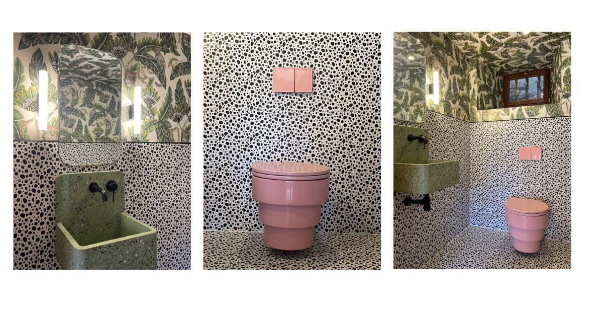 Sink? This one is trickier. Whenever I think of green and pink interiors, I think of one of my closest friends, and who doesnāt want that in the downstairs loo?! Iāve decided matching the sinkĀ exactlyĀ would be overkill. The wallpaper becomes my colour chart, and after endless online searches, I land on THEĀ perfect terrazzo concrete sink from Concretta. Theyāre based in Bulgaria, but they ship across Europe.Ā Tick.